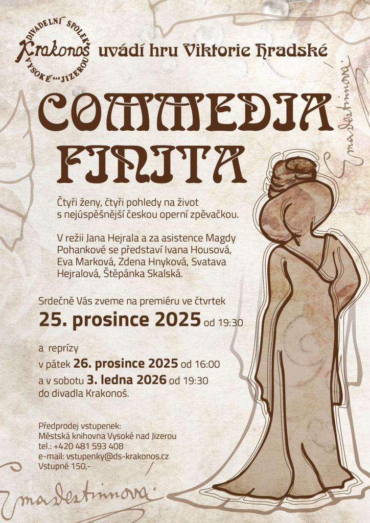 Divadelní spolek Krakonoš z Vysokého nad Jizerou připravuje na vánoční svátky a začátek nového roku mimořádné představení. Režisér Jan Hejral se svým týmem uvádí hru známé české autorky Viktorie Hradské s názvem Commedia finita.