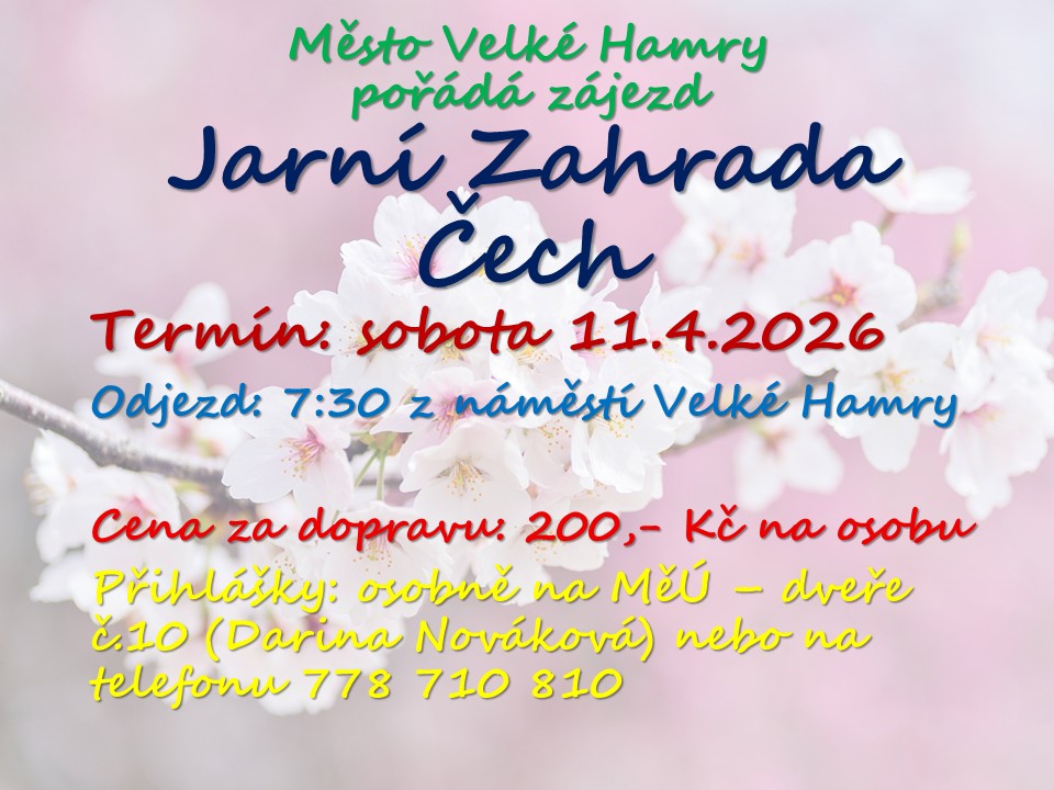 V sobotu 11.4.2026 odjezd 7:30 z náměstí ve Velkých Hamrech