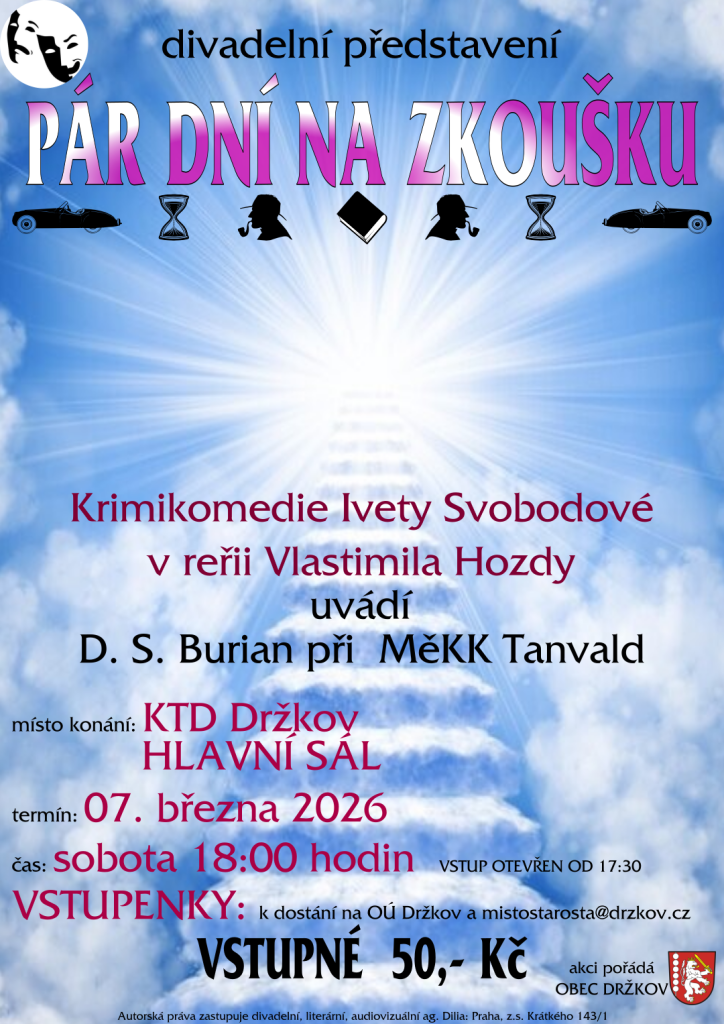 srdečně Vás zveme na divadelní představení Pár dní na zkoušku, které v naší obci sehraje DS E. F. Burian z Tanvaldu.