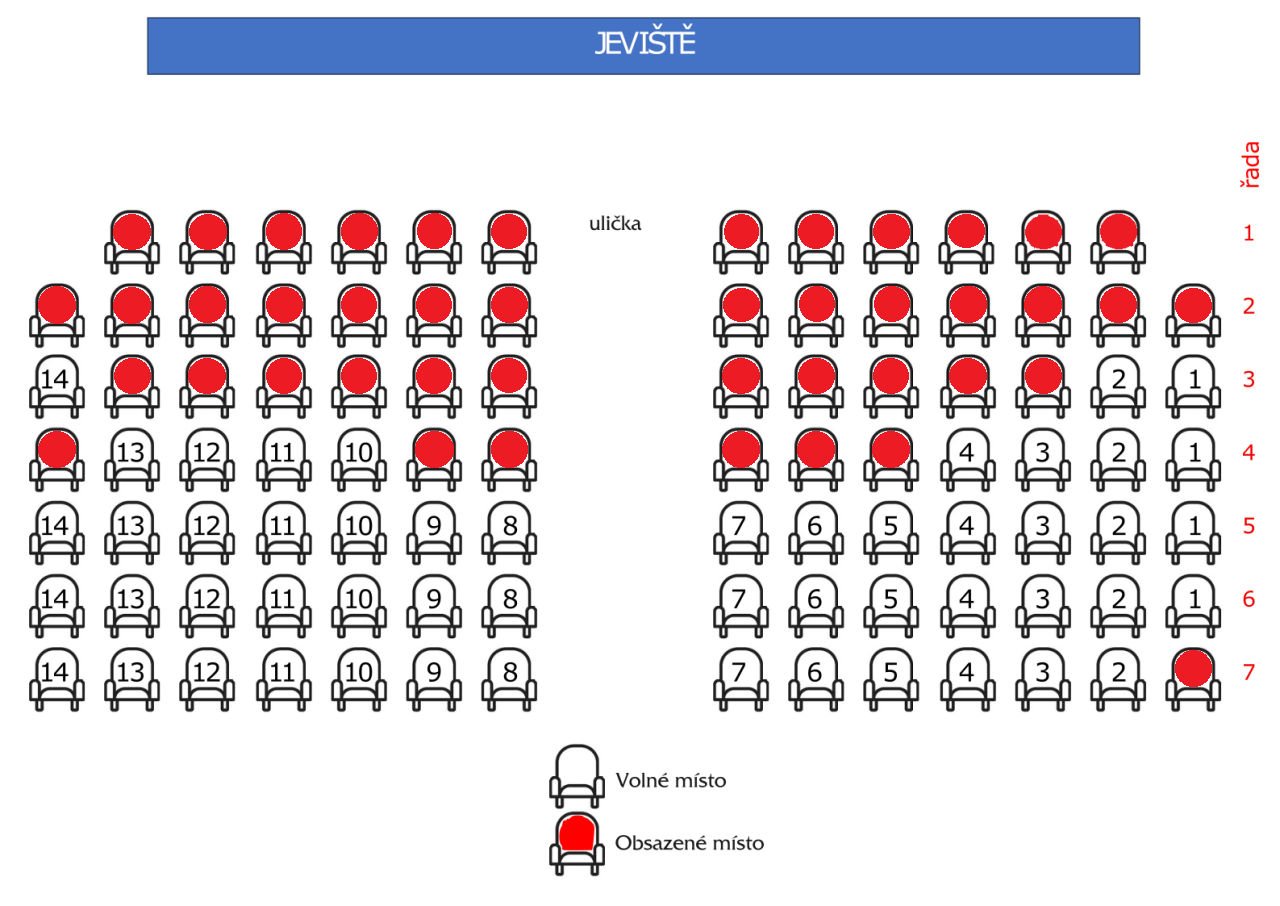 Lístky se kupují na konkrétní místa v hledišti, dle přiloženého plánku vpravo, který je také ve větším měřítku k dispozici níže.